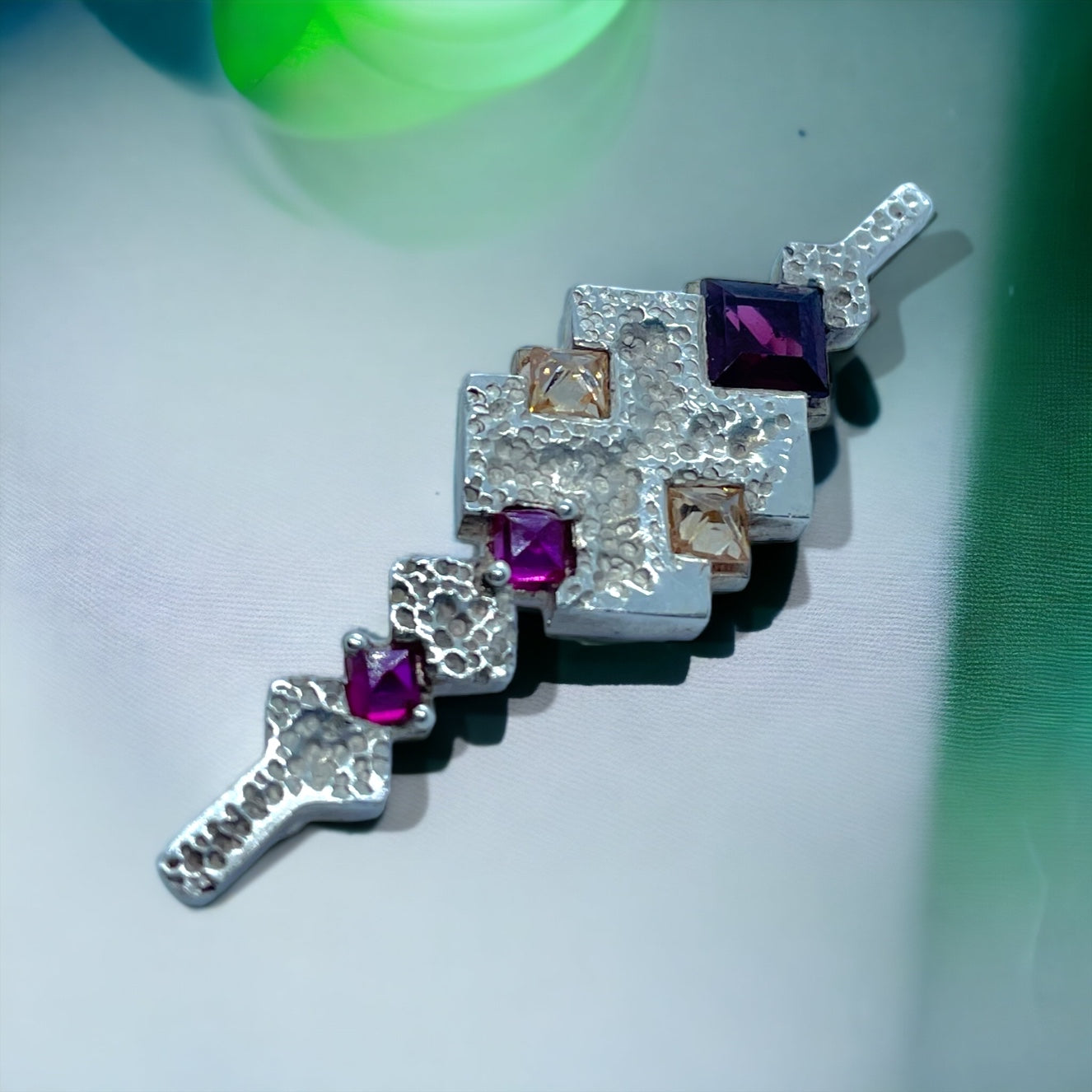 What sets “Gigi” apart is the artful texture achieved through a delicate hammering process, adding an artisanal touch to the design. Adorned with square-cut garnet and tourmaline gemstones, this hairpin exudes vibrant elegance, making it a captivating accessory to enhance your hairdo.